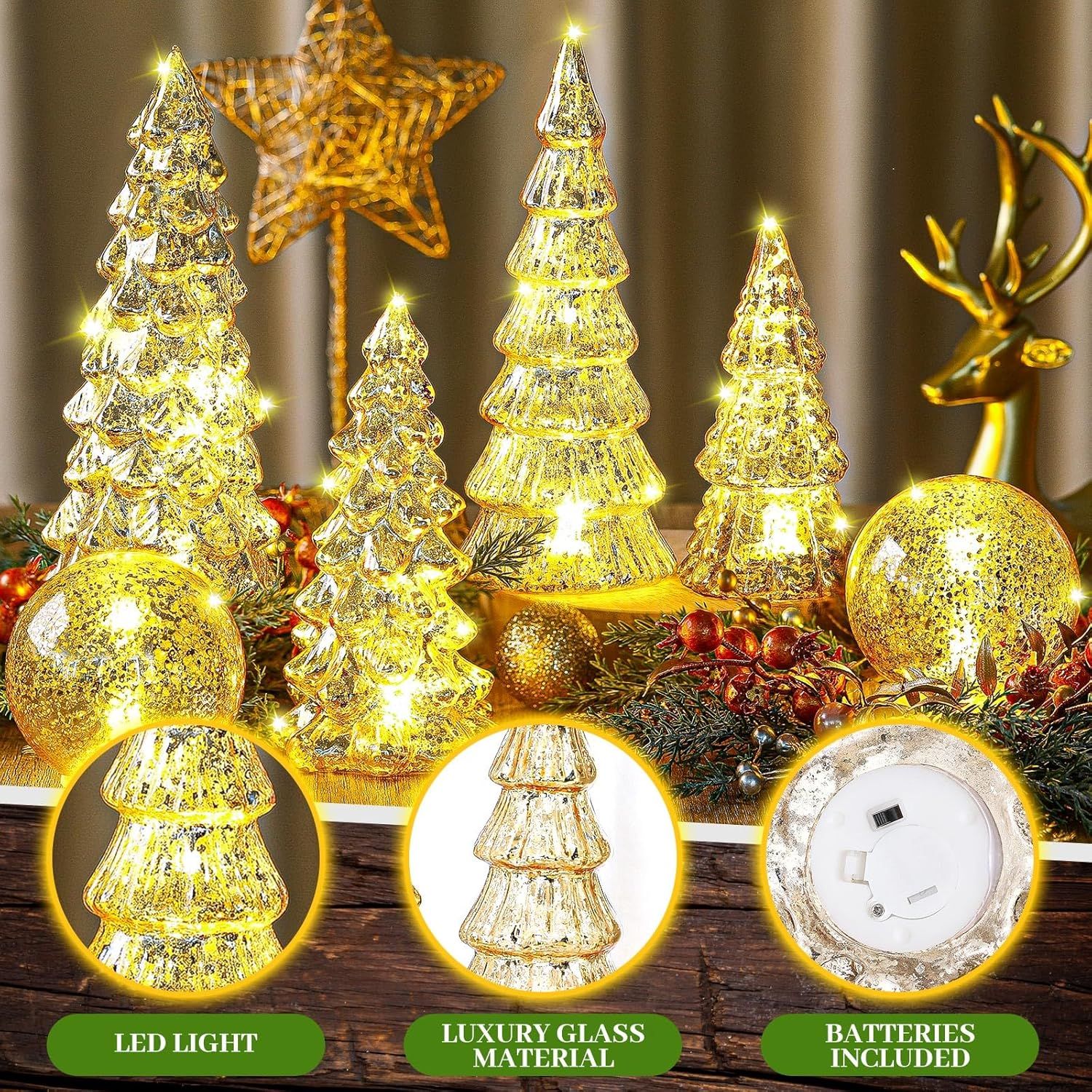 Variety in Design and Size: our package includes 4 distinct styles of mercury glass Christmas trees and 2 mercury crackle glass balls, each varying in size to suit your decorative tastes; Ranging from approximately 8.66 x 3.94 inches to about 5.51 x 2.56 inches, these trees provide a variety of aesthetic options, suitable for adding a dynamic festive touch to any settingShimmering and Elegant Decor: indulge in the holiday with our exclusive glowing glass Christmas tree and mercury crackle glass balls; Featuring an elegant and shimmering design, these trees add a touch of festive sparkle to any room; Drenched in a stunning gold color, these trees exude an enchanting glimmer that brings any space to a festive lifeVarious Sizes: there are three sizes of mercury glass Christmas tree; The first style of mercury glass Christmas tree is about 8.66 x 3.94 inches/ 22 x 10 cm, the second style of mercury glass Christmas tree is about 7.09 x 3.15 inches/ 18 x 8 cm, and the third style of mercury glass Christmas tree is about 5.51 x 2.56 inches/ 14 x 6.5 cm; The gold crack glass ball diameter is about 3.15 inches/ 8 cm; Our mercury glass Christmas trees are for lovers of traditional holiday aestheticsQuality Material: crafted from glass material, these desktop glass Christmas trees promise long lasting use; They are designed to withstand the test of time, letting you relish their radiant charm for many holiday to comeVersatile and Attractive Application: with their versatile design, these Christmas gold tree table decoration lights are reliable for decorating any room in your home, from living rooms to bedrooms; Their versatility extends to hotels and office spaces, bringing a merry wherever they are displayed