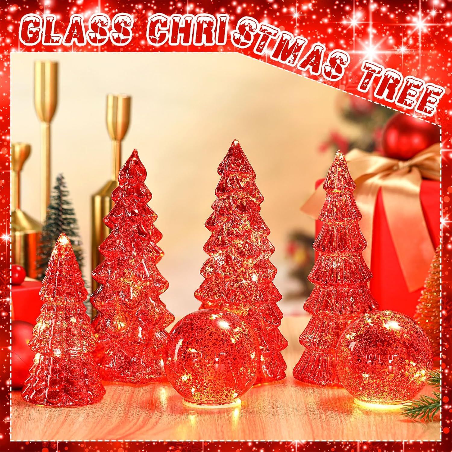 Variety in Design and Size: our package includes 4 distinct styles of mercury glass Christmas trees and 2 mercury crackle glass balls, each varying in size to suit your decorative tastes; Ranging from approximately 8.66 x 3.94 inches to about 5.51 x 2.56 inches, these trees provide a variety of aesthetic options, suitable for adding a dynamic festive touch to any settingShimmering and Elegant Decor: indulge in the holiday with our exclusive glowing glass Christmas tree and mercury crackle glass balls; Featuring an elegant and shimmering design, these trees add a touch of festive sparkle to any room; Drenched in a stunning gold color, these trees exude an enchanting glimmer that brings any space to a festive lifeVarious Sizes: there are three sizes of mercury glass Christmas tree; The first style of mercury glass Christmas tree is about 8.66 x 3.94 inches/ 22 x 10 cm, the second style of mercury glass Christmas tree is about 7.09 x 3.15 inches/ 18 x 8 cm, and the third style of mercury glass Christmas tree is about 5.51 x 2.56 inches/ 14 x 6.5 cm; The gold crack glass ball diameter is about 3.15 inches/ 8 cm; Our mercury glass Christmas trees are for lovers of traditional holiday aestheticsQuality Material: crafted from glass material, these desktop glass Christmas trees promise long lasting use; They are designed to withstand the test of time, letting you relish their radiant charm for many holiday to comeVersatile and Attractive Application: with their versatile design, these Christmas gold tree table decoration lights are reliable for decorating any room in your home, from living rooms to bedrooms; Their versatility extends to hotels and office spaces, bringing a merry wherever they are displayed